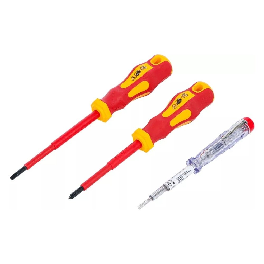 - bestehend aus einem Kreuzschlitz-Schraubendreher, einem Schlitz-Schraubendreher mit magnetischen Spitzen und einem Spannungsprüfer