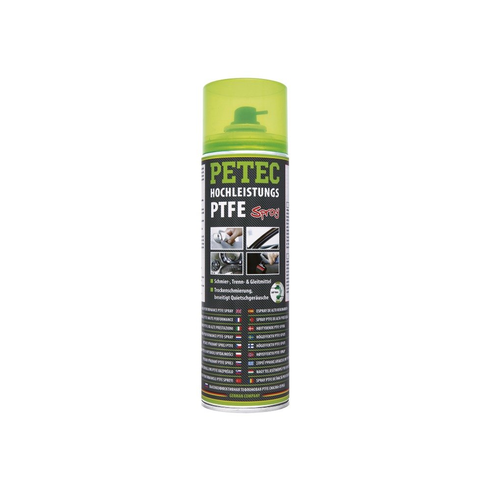 Petec Hochleistungs PTFE Spray ist ein farbloses Schmier-, Trenn- & Gleitmittel. Hervorragend geeignet für sichtbare Schmierarbeiten wie z. B. Sitzlaufschiene, Gurt, Türfangband,