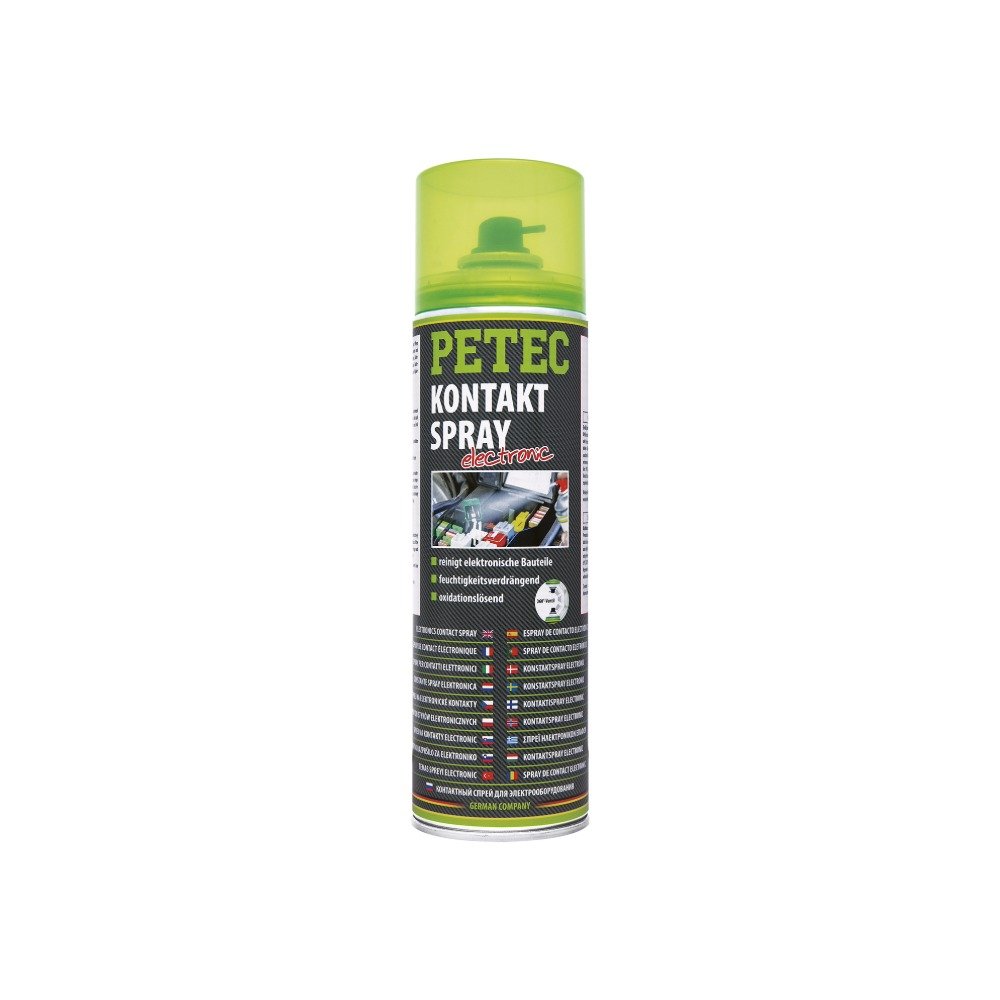 Zur Reinigung, Wartung und Pflege sowie Langzeitkorrosionsschutz von elektronischen Bauteilen und Kontakten (z. B. Kabel-, Steck- und Klemmverbindungen, Sicherungskästen, Sicherungen, Relais, Zündverteilerkappen, Zündkerzen, Generatoren, Anlasser, Batteriepole u.v.m.). PETEC Kontaktspray electronic verhindert Kriechströme und Spannungsverluste.