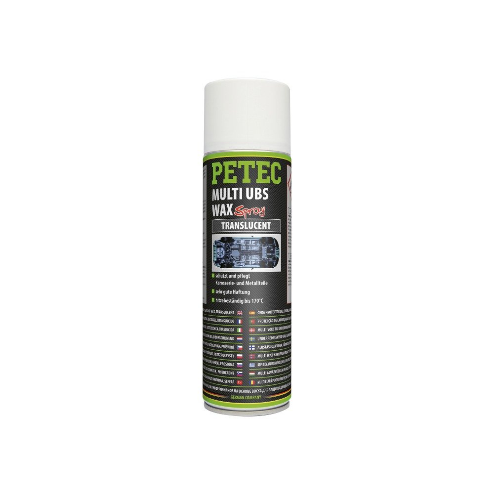 Petec Multi UBS WAX transparent haftet auf allen Oberflächen, auch auf PVC, Bitumen und Wachsschichten. Verdrängt Feuchtigkeit und bietet optimalen Korrosions- und Steinschlagschutz in allen Bereichen. Durch die hervorragende Kriechfähigkeit erreicht Multi UBS Wax auch schwer zugängliche Karosseriehohlräume.