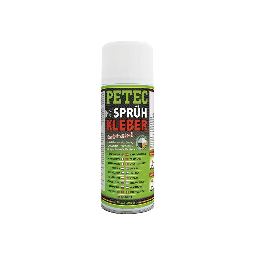 PETEC Sprühkleber mit hoher Sofortklebekraft für flächige Verklebungen im Innen- und Außenbereich sowie saugende und nichtsaugende Materialien einsetzbar. Verklebt Materialien wie z.B. Leder, Schaumstoff, Gummi, Textilien, Filz, Styrol, Holz, Kork, Karton, Papier, Dämm- & Isoliermaterialien, Kunststoffe, Metalle u.v.m. mit- und untereinander. PETEC Sprühkleber eignet sich hervorragend für den Automobilbereich (Dachhimmel, Hutablage, Verkleidungen, Dämmmatten, Folien u.v.m.), Caravan, Boot, Industrie, Handwerk, Modellbau, Haushalt u.v.m.