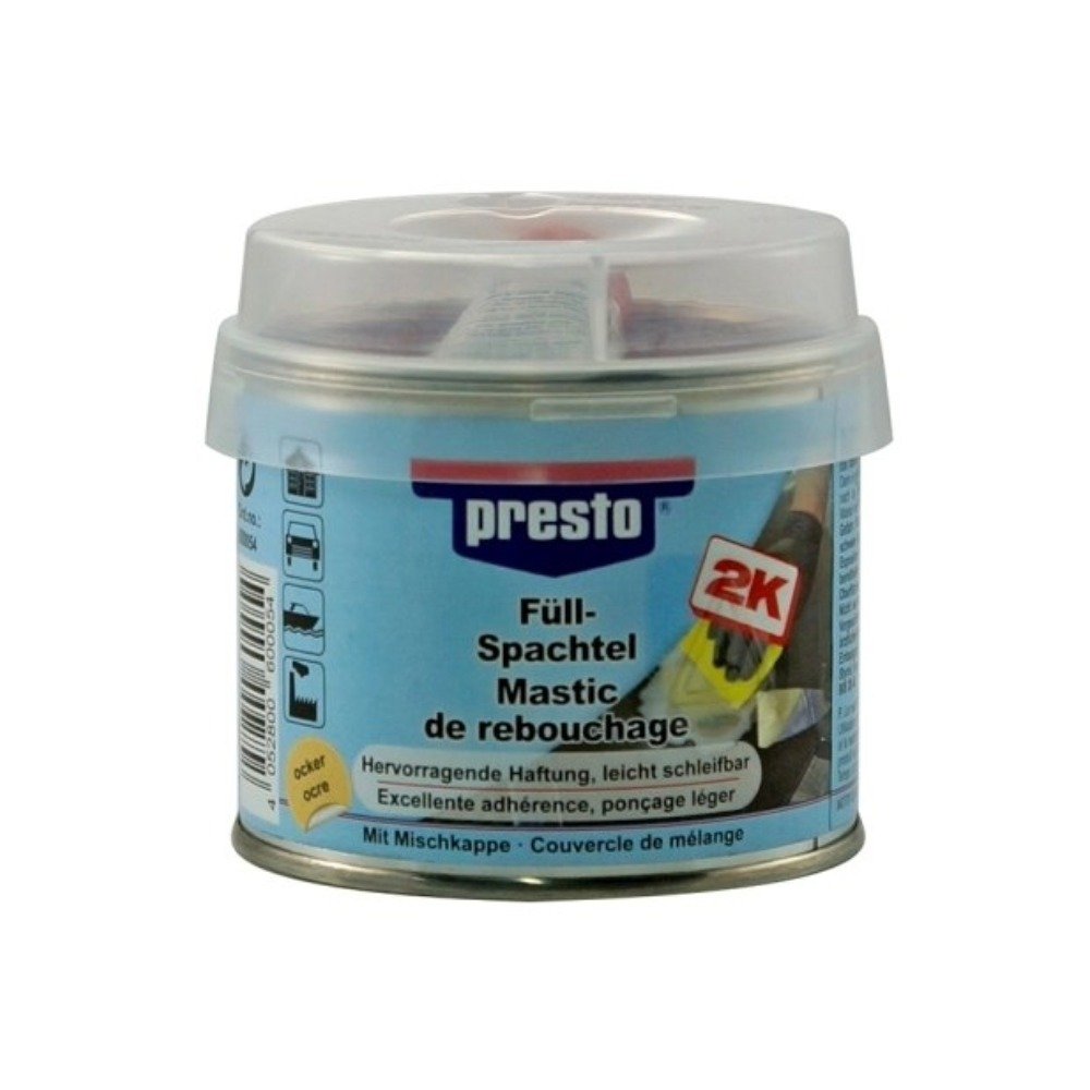2K Füll und Ziehspachtel als Mischung eines mittelelastischen, hochreaktiven, aminvorbeschleunigten Polyesterharzes mit verschiedenen mineralischen, umweltfreundlichen Füllstoffen. Produkteigenschaften: Schleifbar nach ca. 20 – 30 Minuten · Asbest- und silikonfrei · Softig und thixotrop · Flammpunkt: ca. 33°C · Topfzeit bei 20°C :ca. 4 Minuten · Dichte: 1,85 kg/dm³ · Härterzugabe: 2 – 4 % · Beständig gegen: Säuren, Laugen, Wasser und Tausalze · Geeignet für Einbrennlackierung · hohe Elastizität, gute Haftung · Temperaturbeständigkeit: 120 C bei ausgehärtetem Material.