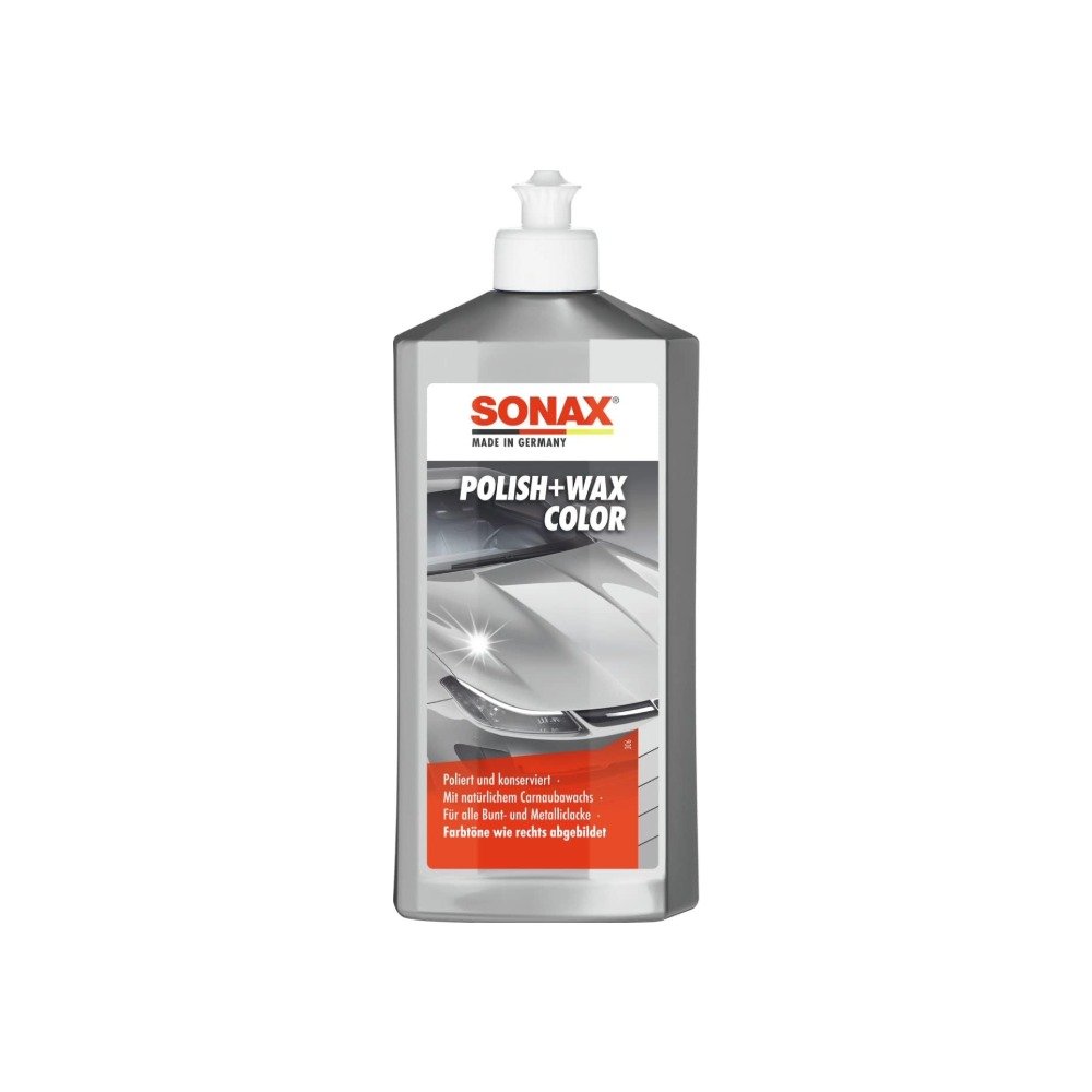 Mittelstarke Politur für neuwertige und leicht matte Lacke mit Farbpigmenten und Wachsanteilen. Glättet, poliert und konserviert alle Bunt- und Metalliclacke in einem Arbeitsgang. Kleine Kratzer und Lackbeschädigungen werden durch die Farbpigmente überdeckt und vor Korrosion geschützt. SONAX Polish+Wax Color verleiht dem Lack leuchtende Farbkraft, sorgt für brillanten Hochglanz und witterungsbeständigen Langzeitschutz durch echtes natürliches Carnaubawachs.