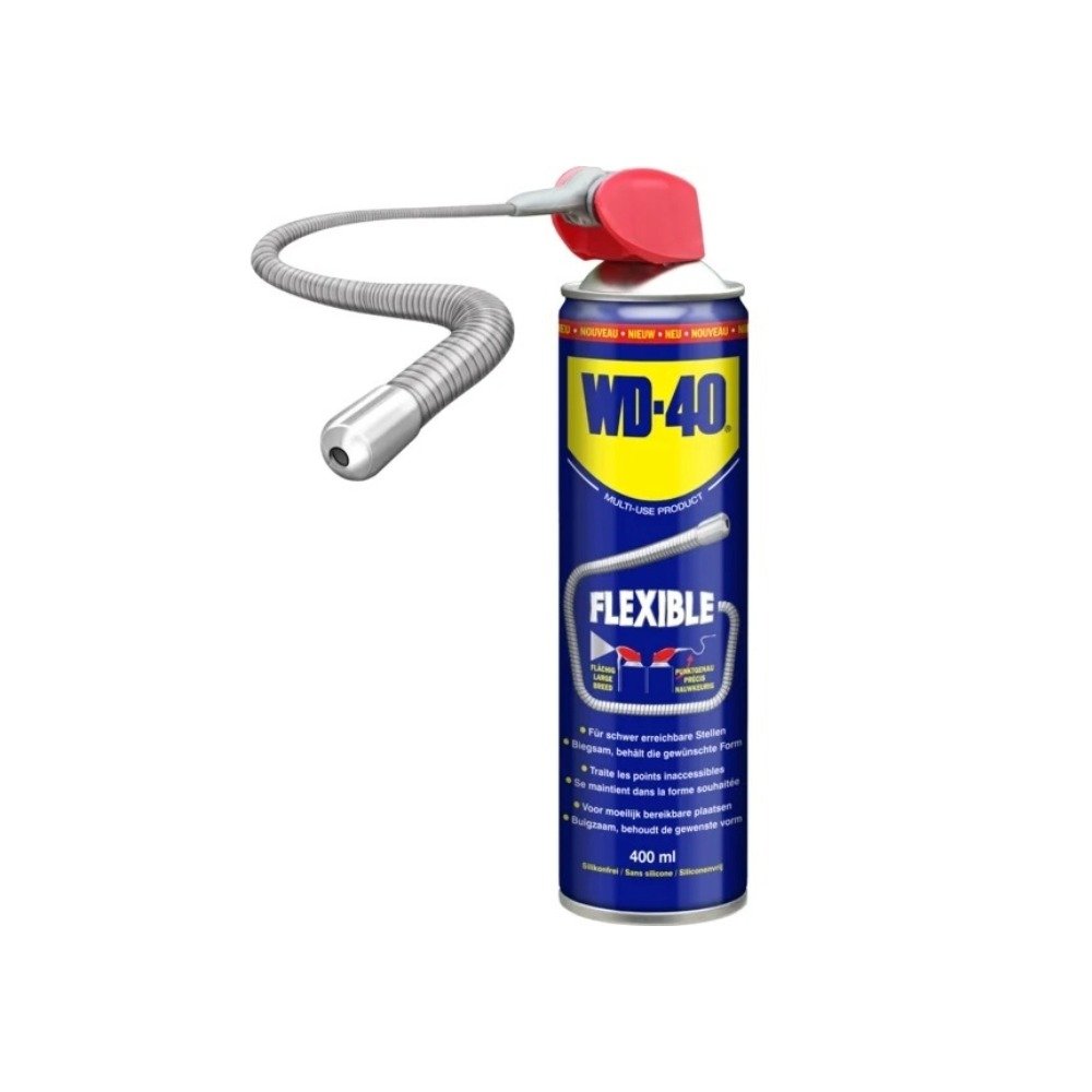 Das WD40 Multifunktionsprodukt Flexible schützt Metall vor Rost und Korrosion, dringt in eingeklemmten Teilen vor, verdrängt Feuchtigkeit und schmiert fast alles. Es entfernt sogar Fett, Ruß und anderen Schmutz von Oberflächen.